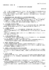 申し入れでは、村岡敏英選挙対策委員長(衆議院議員/秋田3区)が、「今年度はすでに過去最多の死亡者を記録、市街地出没も頻発し、これまで経験したことのない危機的事態となっている。対応している自治体もマンパワーが全く足りない状況であり、自衛隊による後方支援を含めて取り組んでほしい」と要望した。