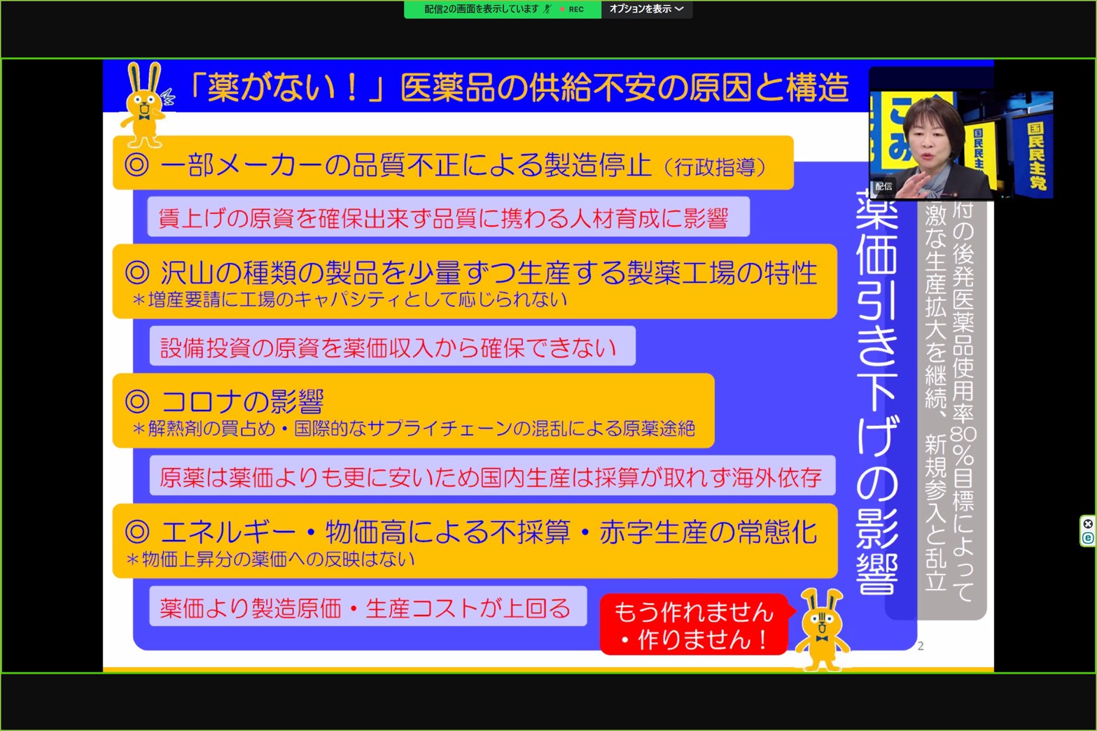 田村議員は冒頭、「薬価の毎年改定が続き、結果として医薬品の供給不安や新薬開発力の低下を招いている。必要な薬が日本で確実に使えるよう、制度の見直しが急務だ」と語った。