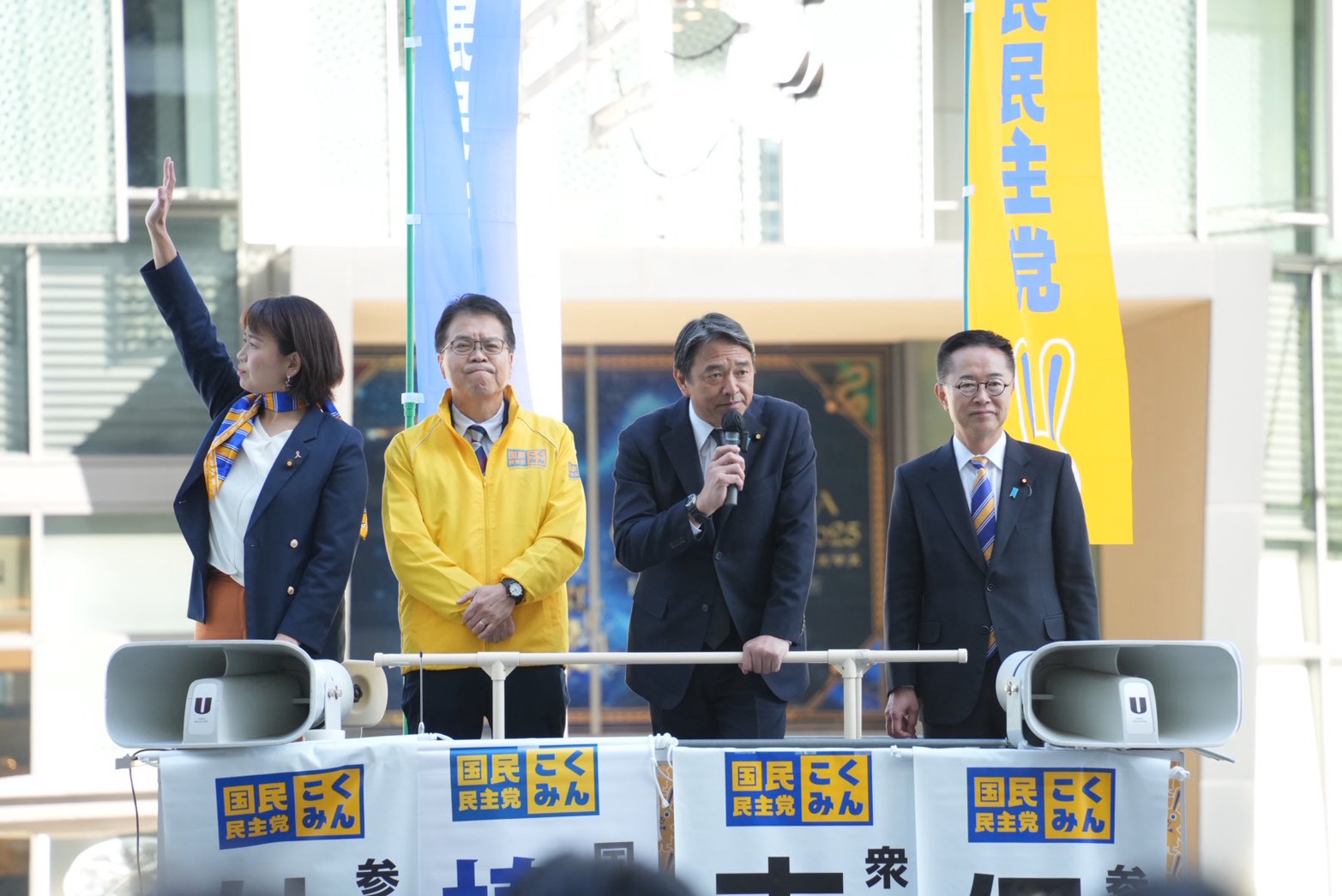 街頭演説で榛葉幹事長は、「日本の政治が大きく変わろうとしている。今求められるのは、国民サイドに立ち、政治を前に動かそうと本気で思った政党と、本気の政治家と、本気の有権者だ」と述べ、「国民が望むのは、払い過ぎた税金を返していくこと。この中部から、この名古屋から、日本を元気にしていく」と訴えた。