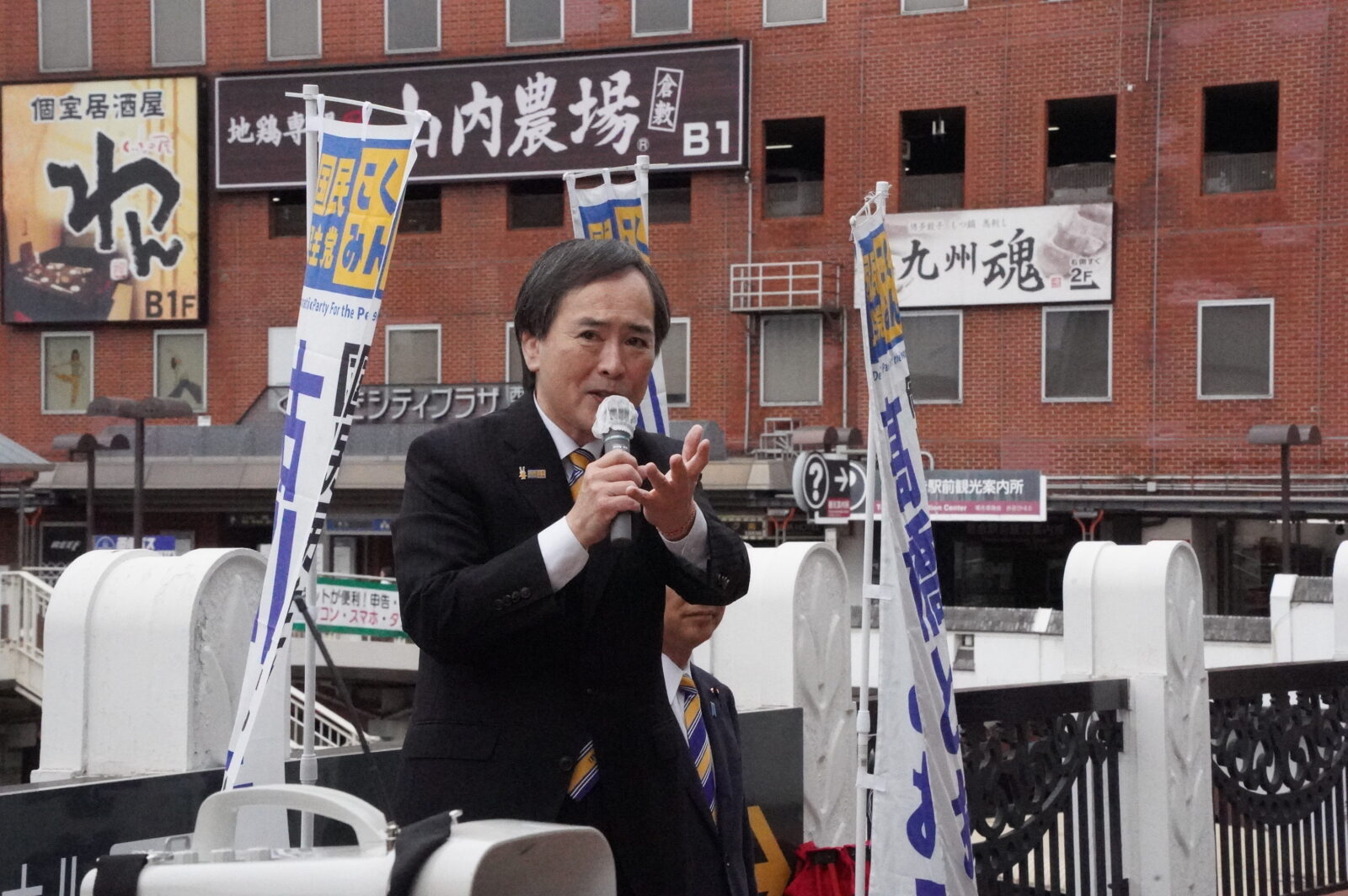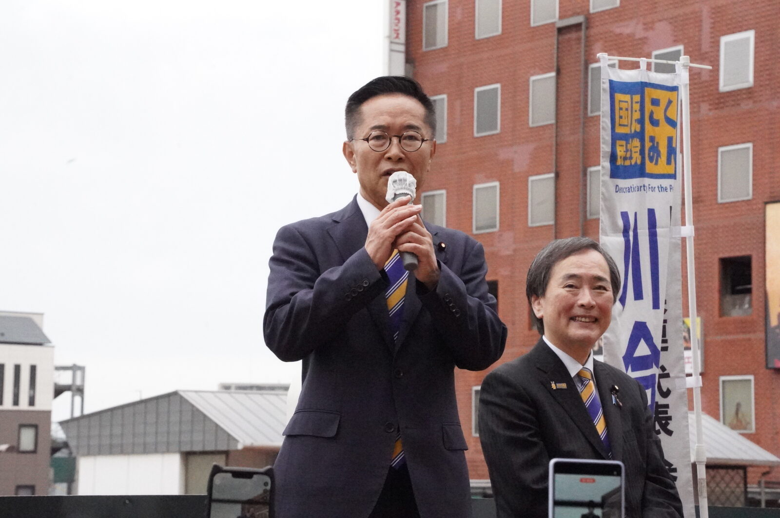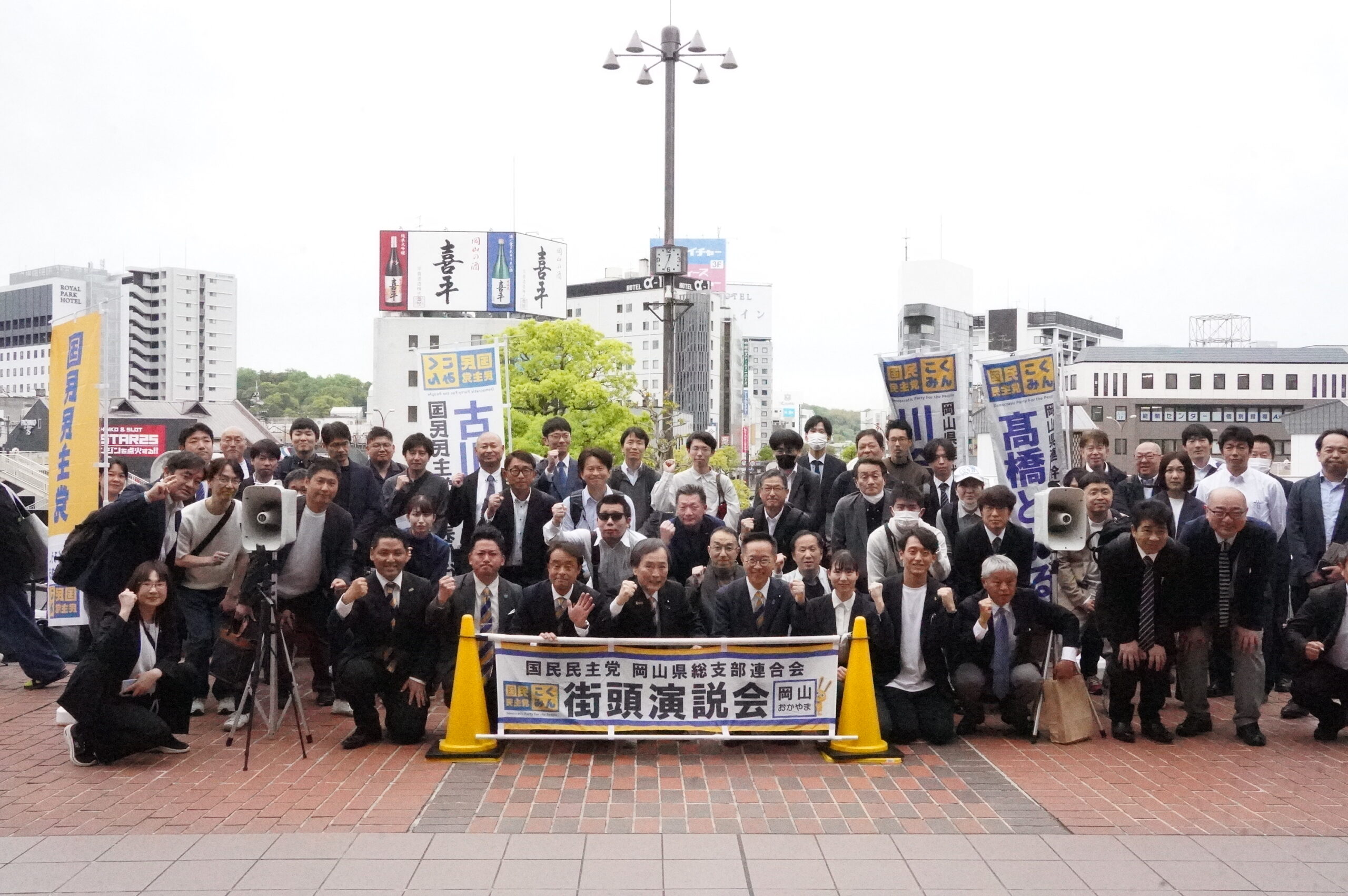 定期大会後には、倉敷駅前で街頭演説会を実施。イラン情勢を踏まえた物価高対策や、ガソリン暫定税率廃止の実績などについて、聴衆に訴えた。