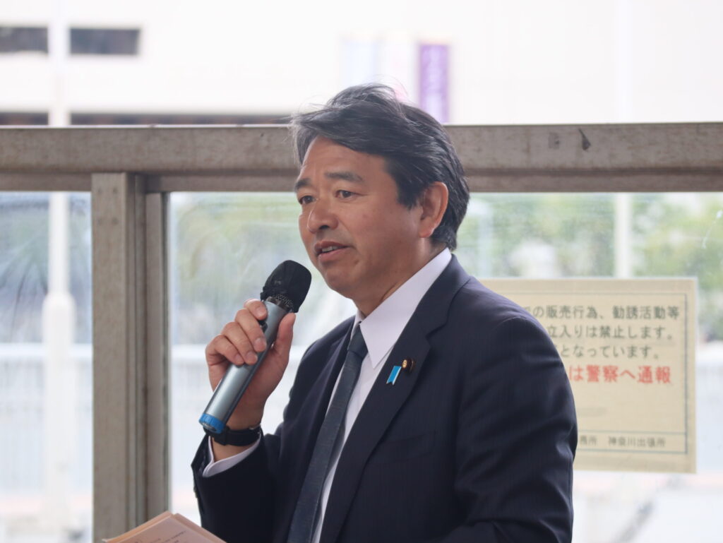 榛葉賀津也幹事長(参議院議員/静岡県)は6日、横浜市会議員選挙に立候補しているみやぎ素延市議候補(公認新人/神奈川区)の応援に駆けつけ、東神奈川駅西口で行われた街頭演説会に参加した。
