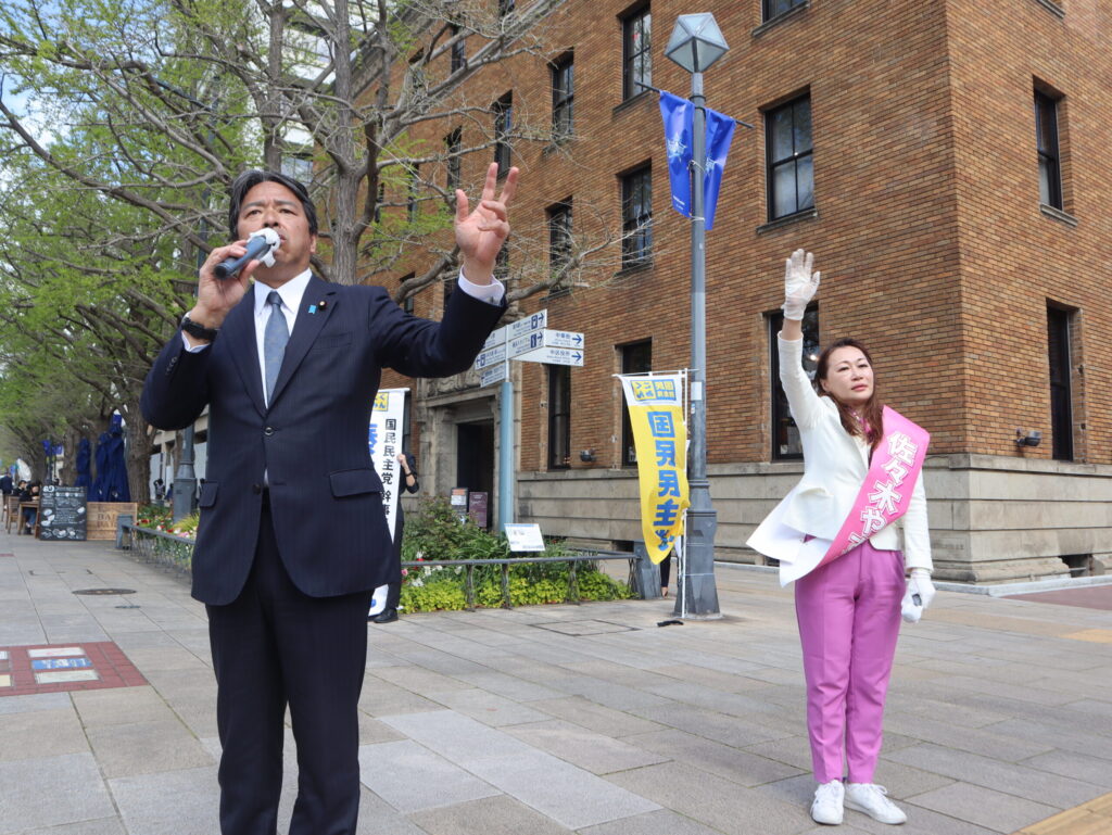 榛葉賀津也幹事長(参議院議員/静岡県)は6日、神奈川県議会議員選挙に立候補している佐々木やすこ県議候補(公認新人/横浜市中区)の応援に駆けつけ、横浜公園交差点で行われた街頭演説会に参加した。