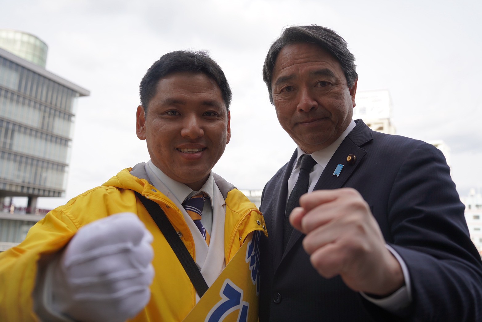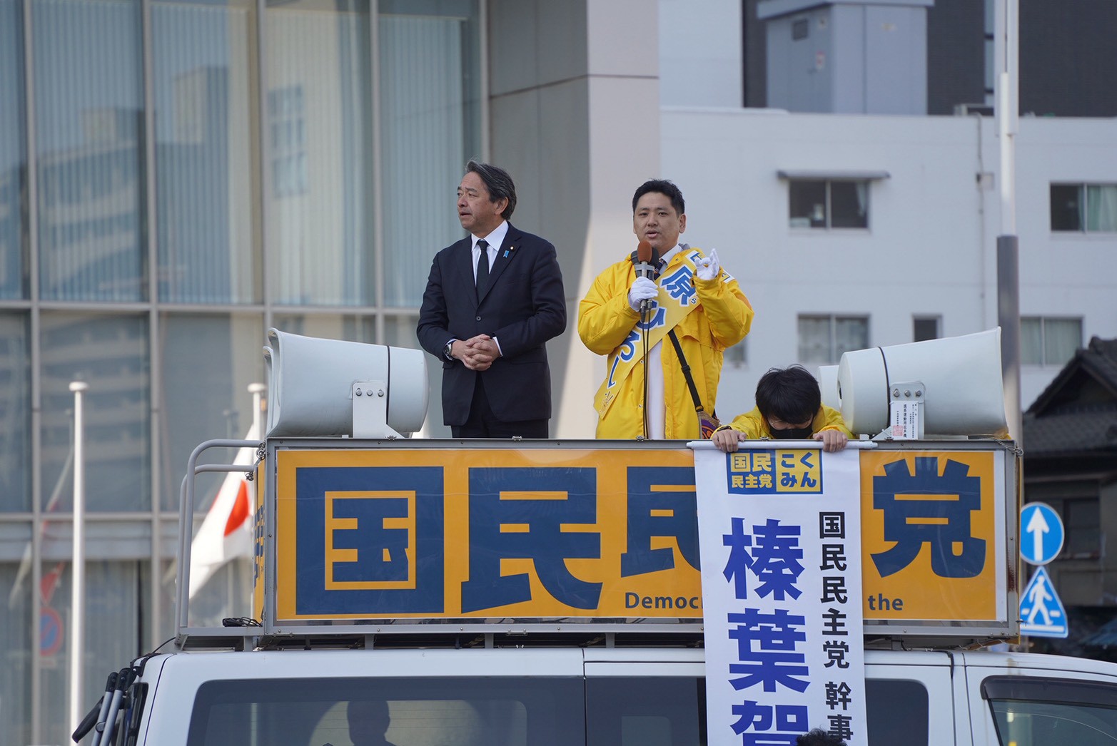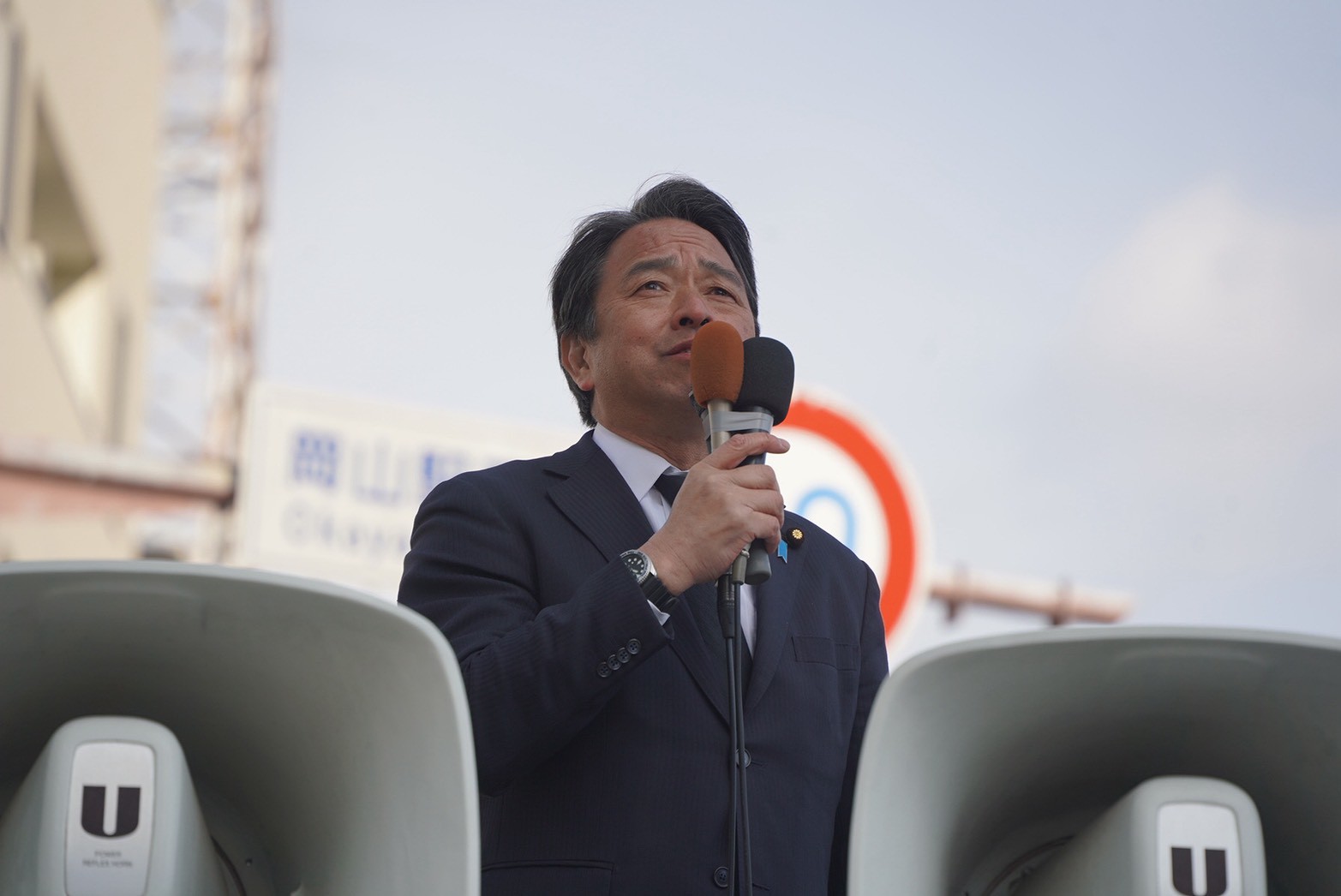 榛葉賀津也幹事長(参議院議員/静岡県)は28日、「原ひろし候補」(岡山1区)の応援に岡山駅前に訪れた。