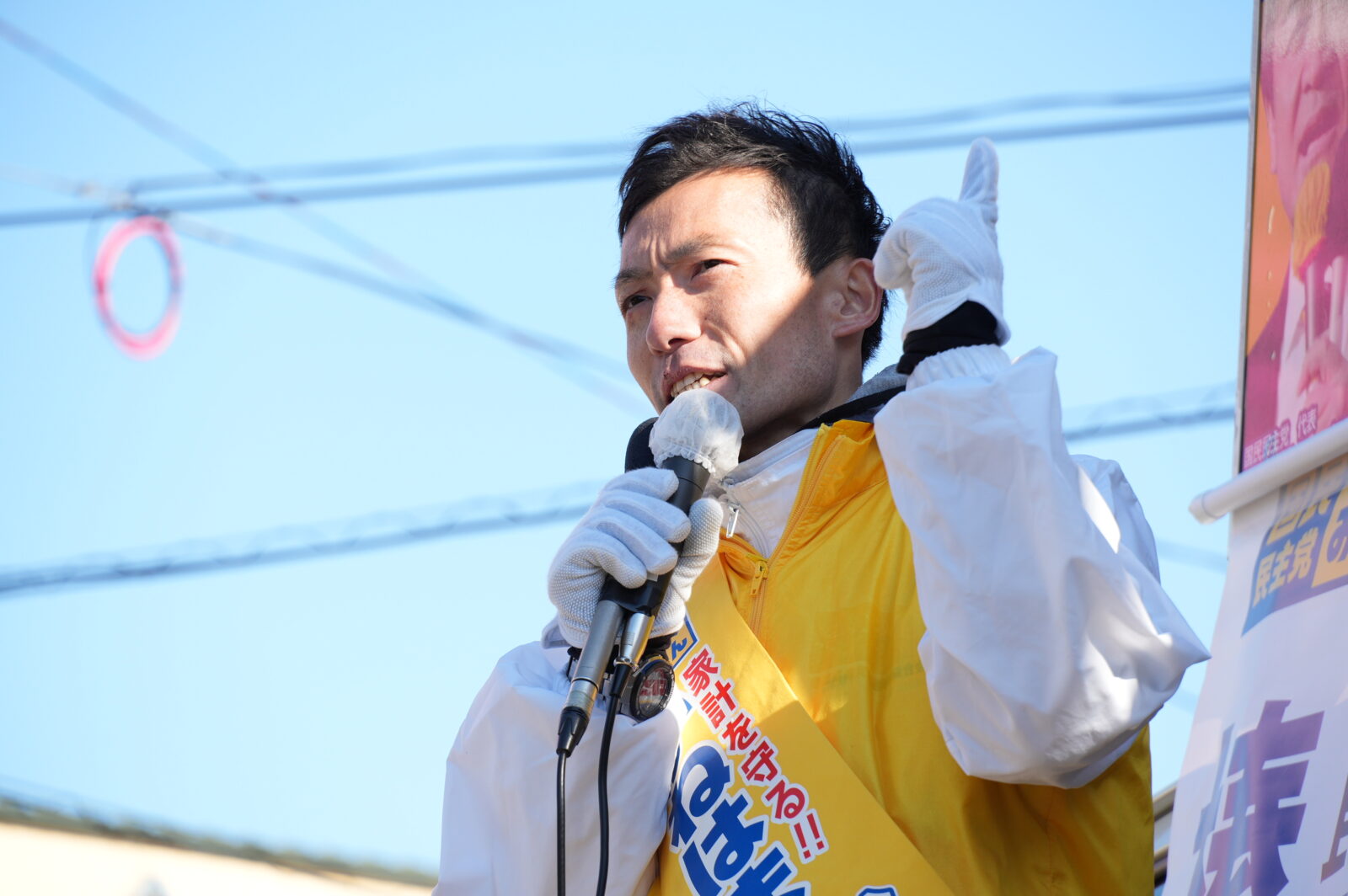 続いて榛葉幹事長は、「1年3カ月前、かねはま候補が総選挙に初挑戦してから支援を続けていただいたみなさんに感謝申し上げる」と集まった聴衆に御礼を述べた。そして、「与党過半数があった時代、年収の壁は引きあがらなかったし、ガソリンの暫定税率も廃止されなかった。動きだした政治をもっと前に進めるために、かねはま候補を国会へ送ってほしい」と述べた。