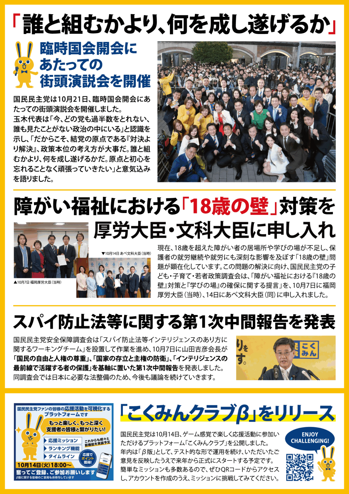 国民民主PRESS・号外「年少扶養控除復活法案提出」版(令和7年10月31日)を発行しました。A4サイズの両面デザインとなります。