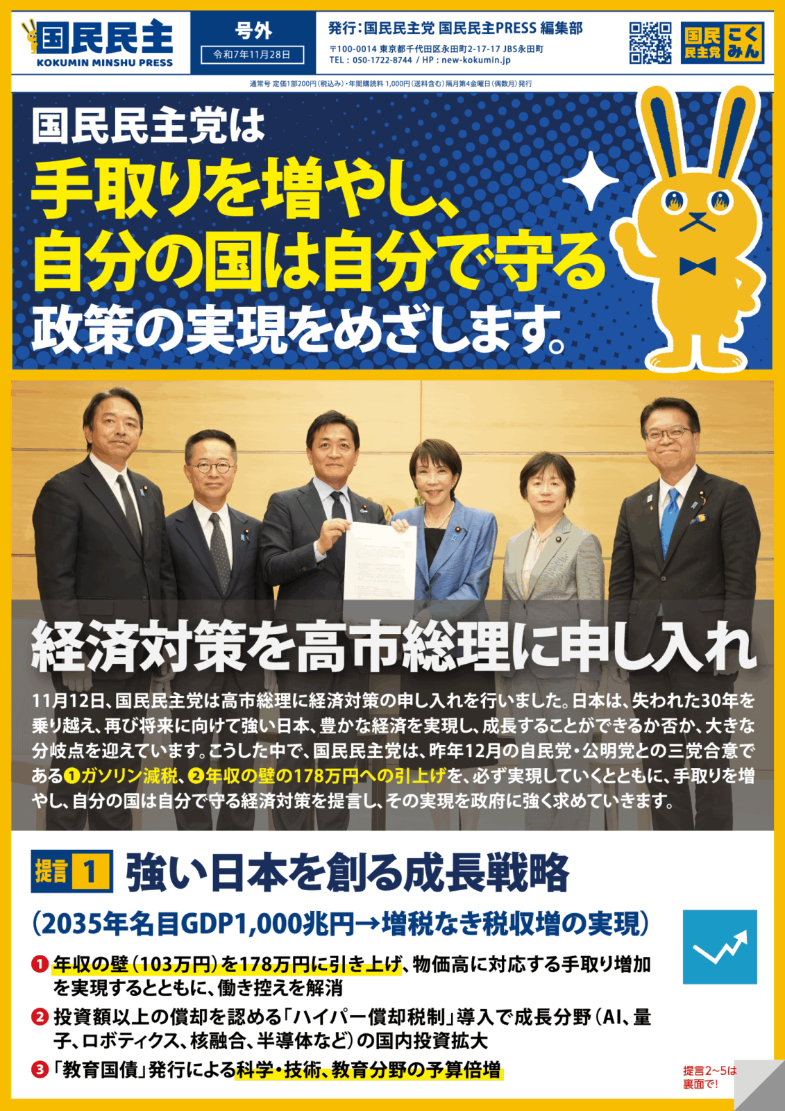 国民民主PRESS・号外「手取りを増やし、自分の国は自分で守る経済対策」版(令和7年11月28日)を発行しました。A4サイズの両面デザインとなります。
