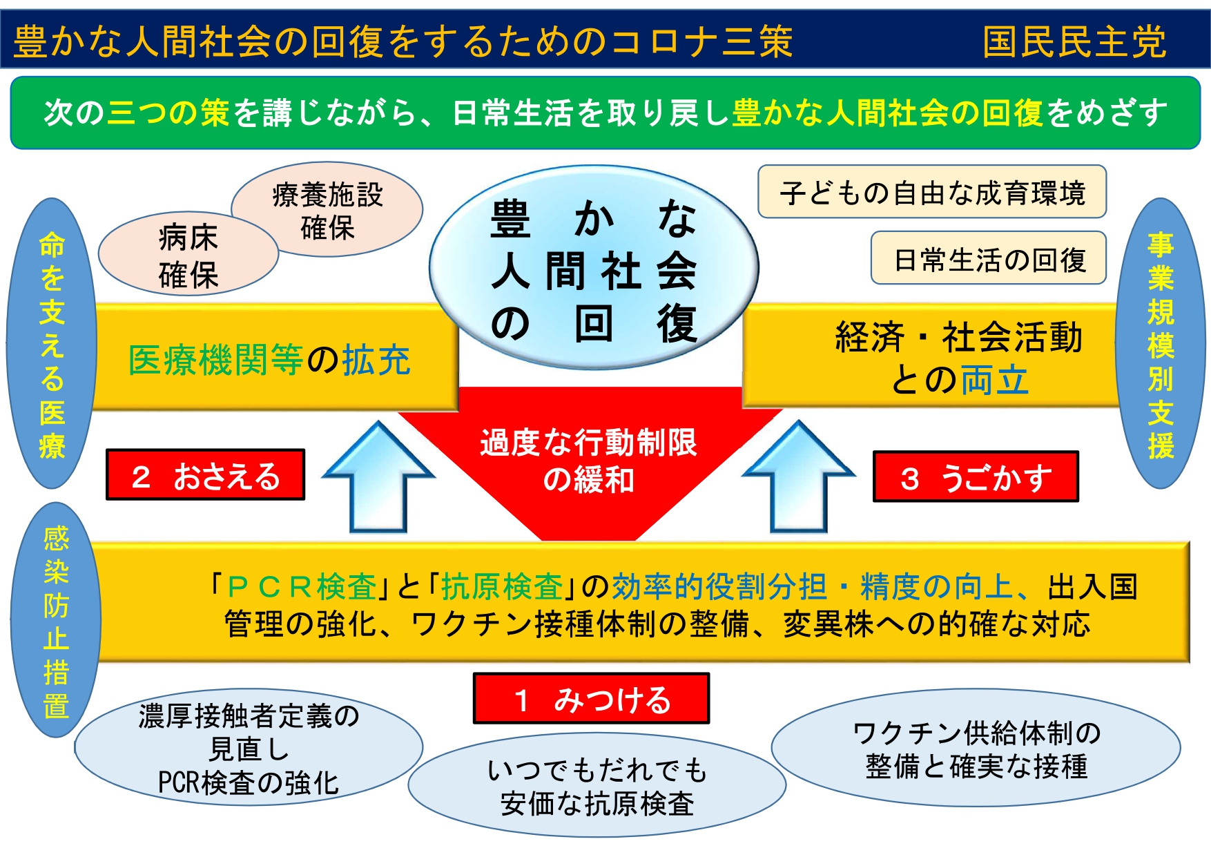 以上のような観点にたち、過度な行動制限の緩和を実現し、豊かな人間社会を回復するため、国民民主党は次のようなコロナ三策を提案する。